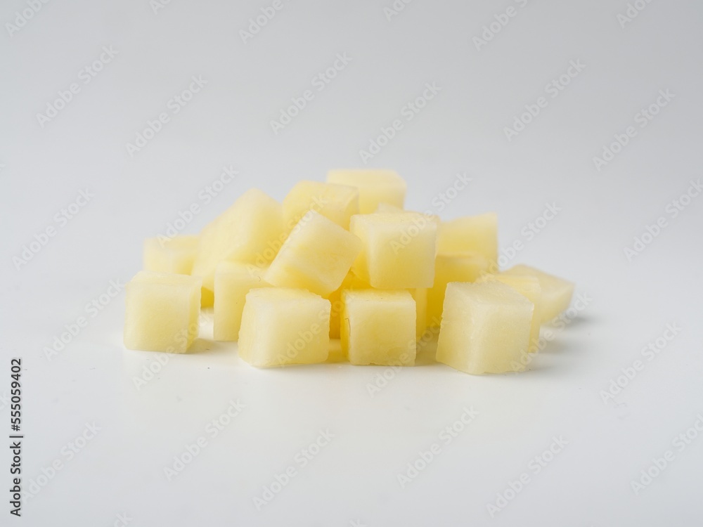 Heap of diced raw potatoes isolated on white