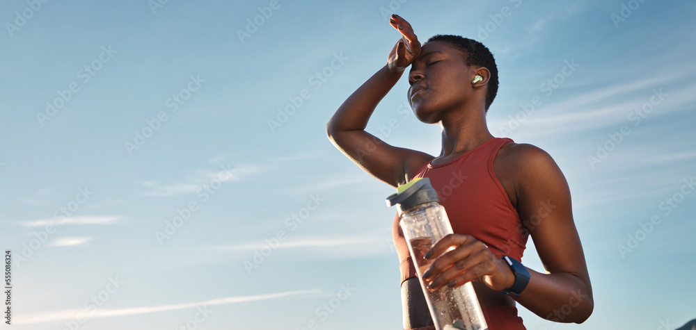 Water bottle, tired and black woman on break after running, exercise or cardio workout with low angle and mock up. Sports, fitness and sweating female holding liquid for hydration after training.