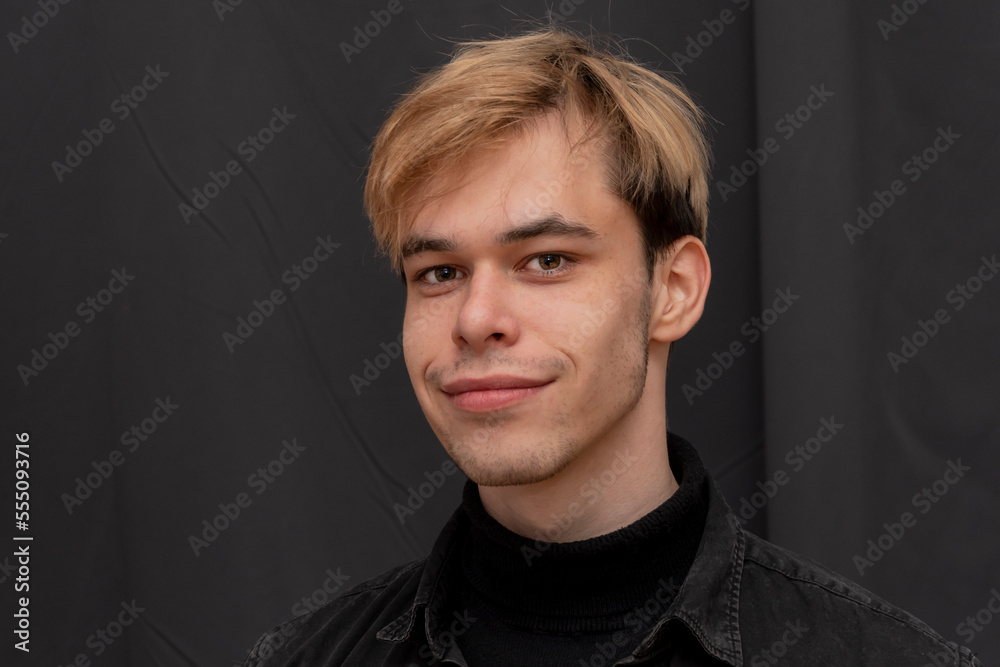 Portrait of a smiling young guy 20-25 years old, dyed blond hair, on a black background, looks directly into the camera.
