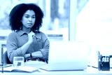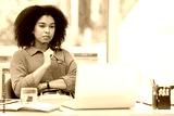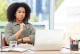 Business laptop, thinking and black woman in office trying to solve problem. Idea, focus and female employee from South Africa with computer contemplating solution, pensive or lost in thoughts alone.