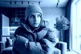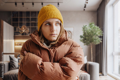 Woman in a warm down jacket trying to keep warm at home. Home heating shutdown concept. Gas shutdown.