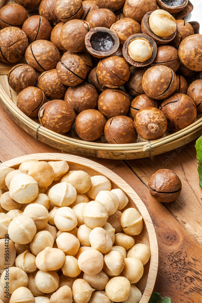 Roasted Macadamia nut in wooden plate on wooden background, Macadamia nuts on wooden background.