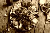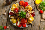 saj of lamb on old wooden table top view