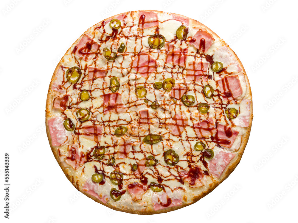 Pizza with meat and barbecue sauce with jalapeno isolated on white background top view