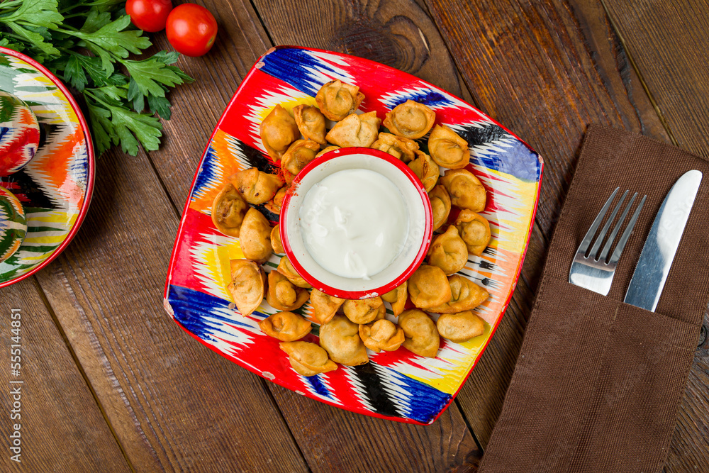 fried dumplings with sauce on old wooden table top view