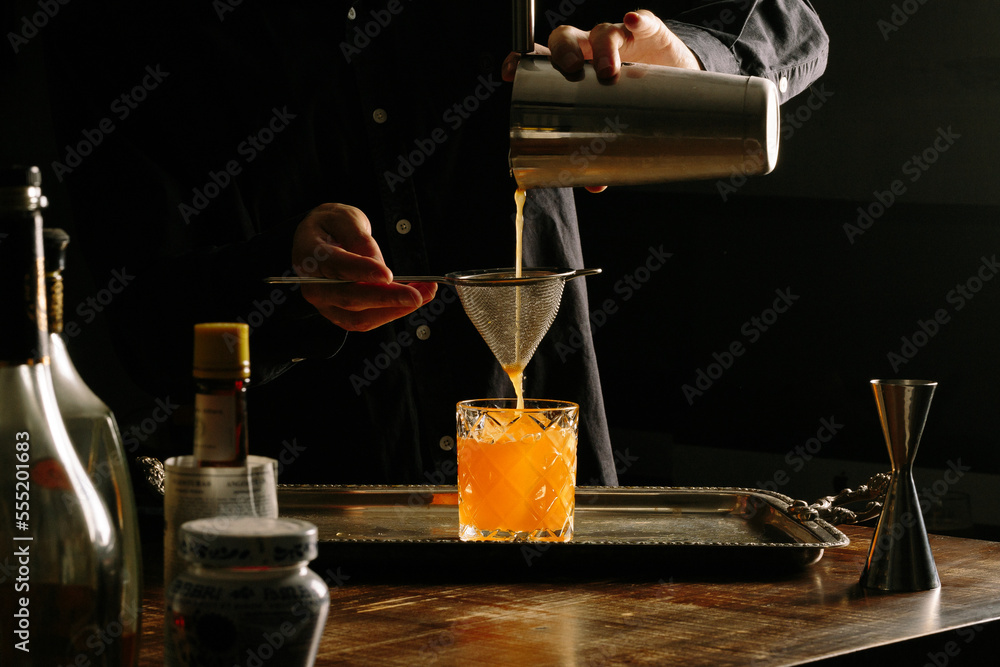 male bartender pouring a cocktail with a cocktail shaker straining into a rocks glass