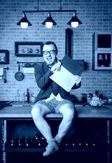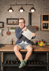 Angry handsome man wearing suit and underpants working at home online siting on the kitchen table and smashing his laptop