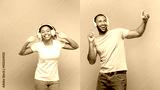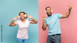 Favourite playlist. Excited carefree black couple enjoying music in wireless headphones over blue and pink background