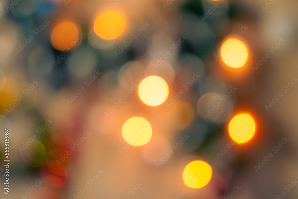 The blurry lights of the Christmas tree are out of focus. Abstract background with bokeh.