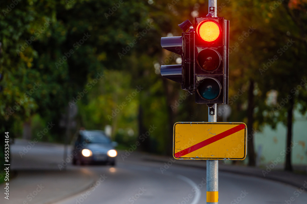 traffic semaphore with red light on defocused background of autumn city, closeup