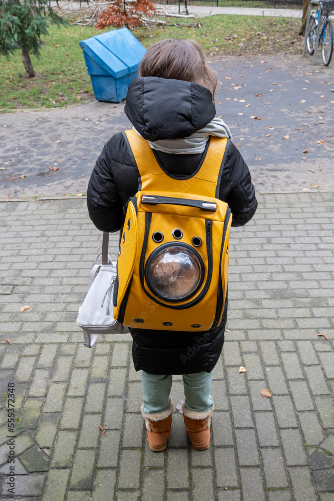 A red cat in a shoulder carrier for animals on the back of a woman, selective focus.