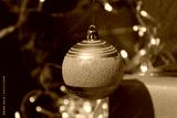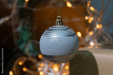 The balloon is hanging on a decorated Christmas tree, Christmas tree garlands and lights.