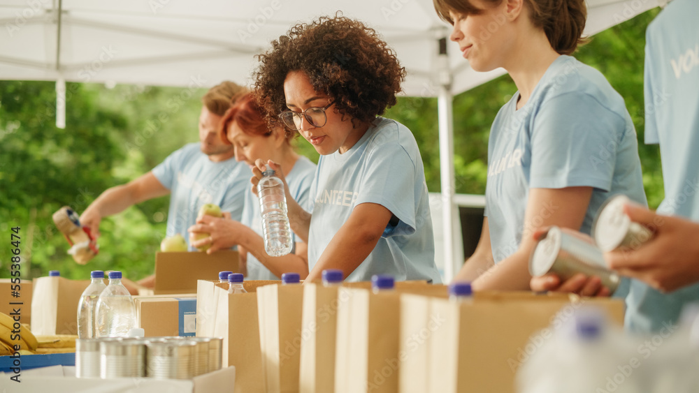Portrait of a Happy Female Volunteer Preparing Free Food Delivery for Low Income People. Charity Workers and Members of the Community Work Together in Local Humanitarian Aid Donation Center.