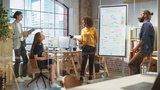 Positive Businesswoman Making a Team Presentation in a Meeting Room in Creative Office. Excited Arab Female Discussing a New Project Plan on Digital Whiteboard Display