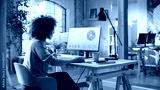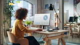 Portrait of a Happy Middle Eastern Manager Working in Creative Office. Business-Driven Stylish Female with Curly Hair Using Desktop Computer with a Calendar Software on Screen Display.