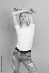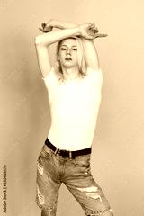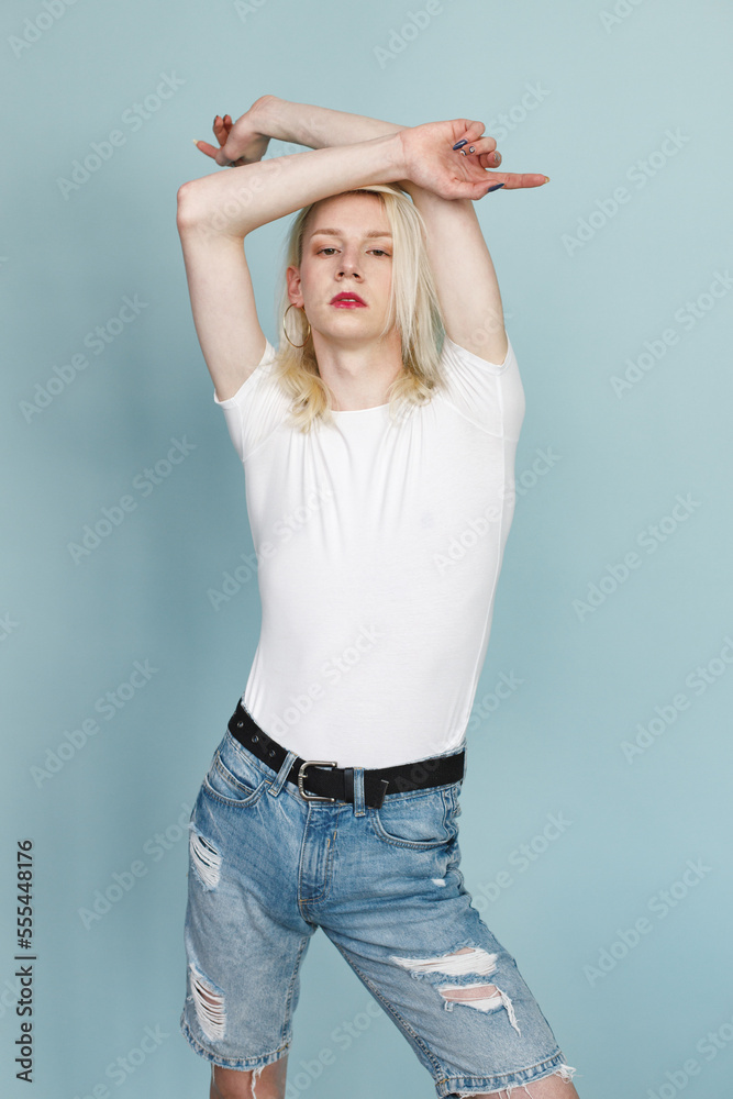 Studio photo of a fashionable man with make up isolated on blue background