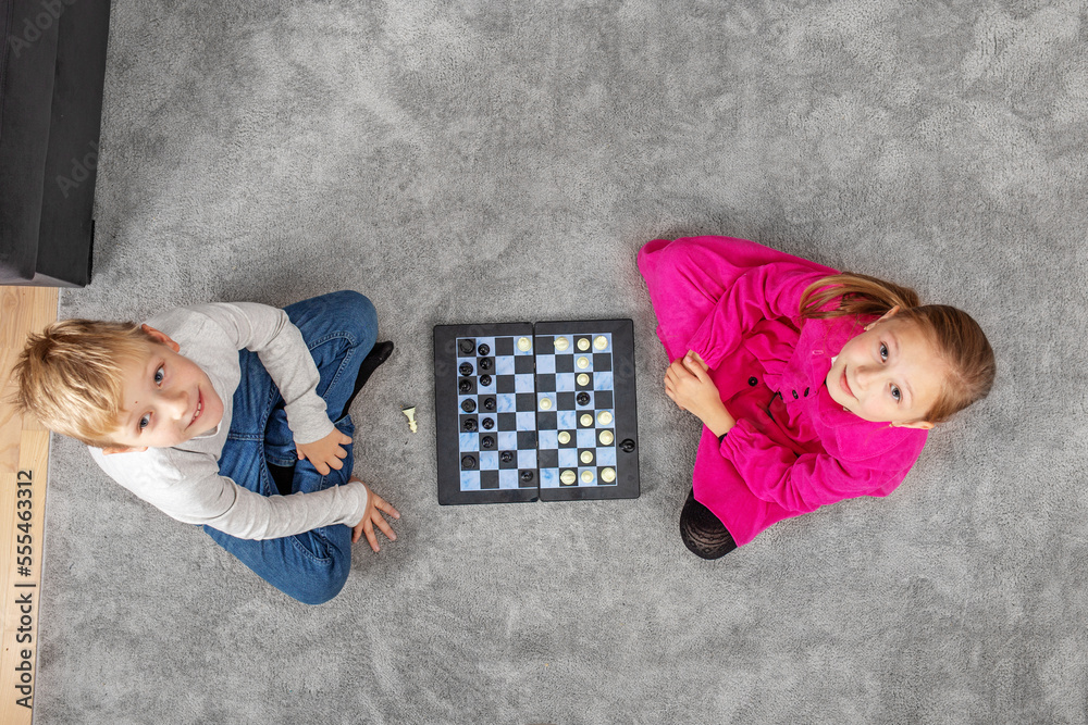 Children play a game of chess. Concept of family, hobby and leisure. Top view