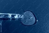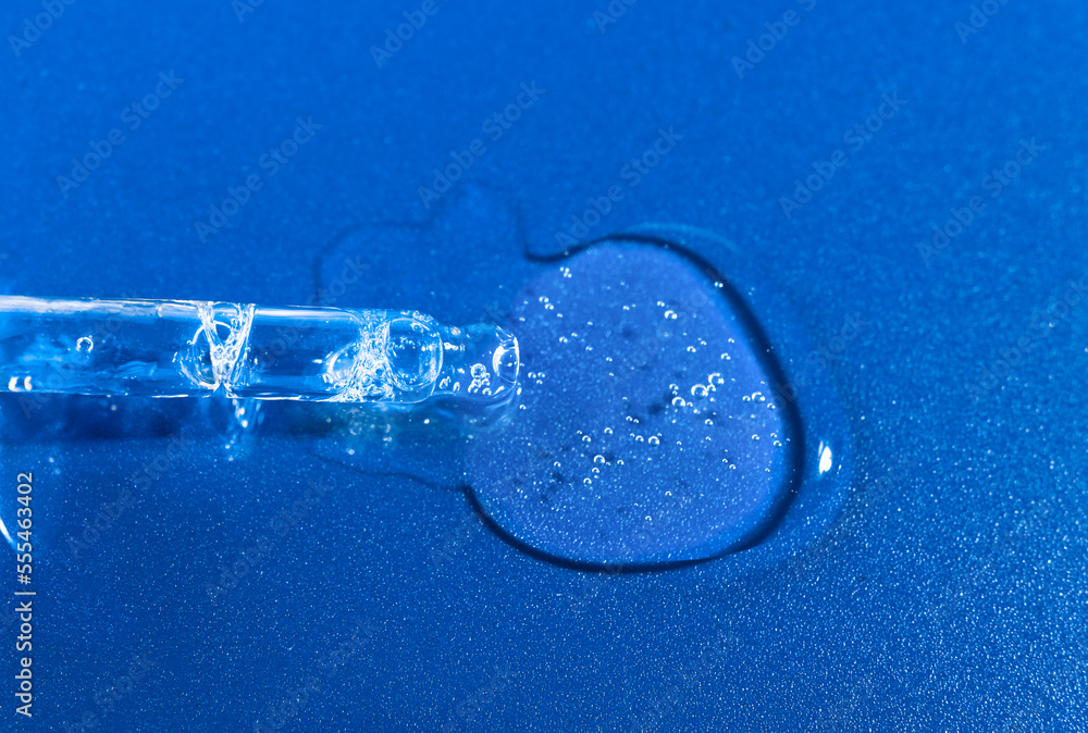 Transparent cosmetic drop with a glass pipette on a bright blue background with copy space. Beauty background with liquid transparent cosmetics.