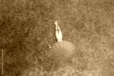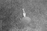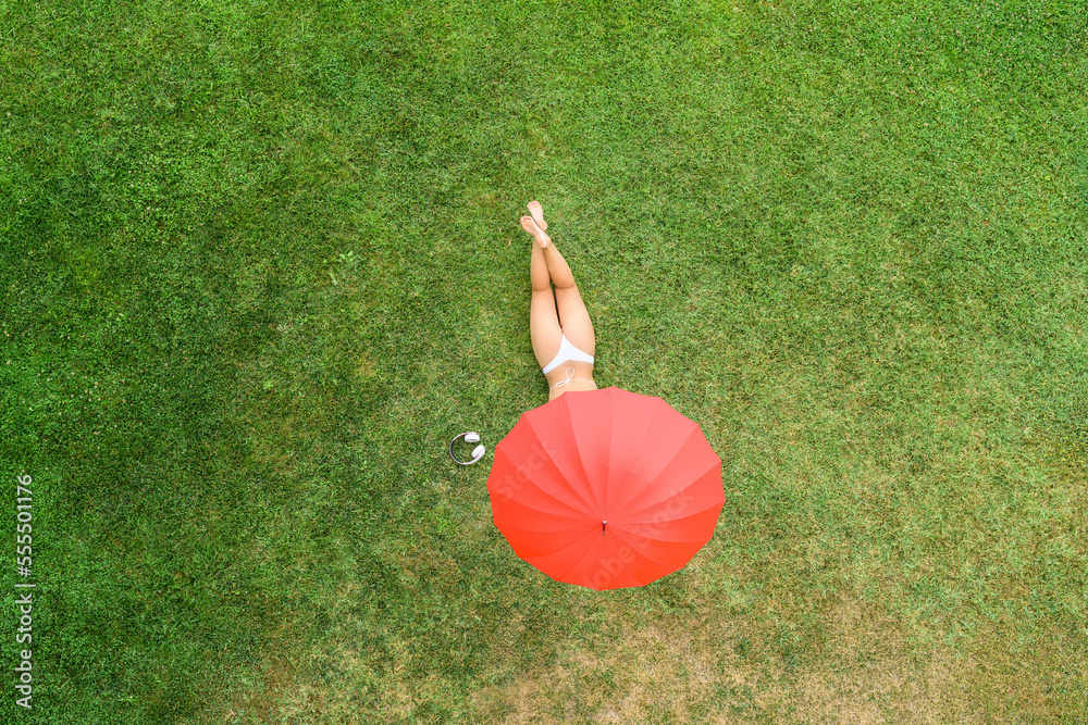 Woman in white bikini lying under red umbrella on the green grass sunbathes at summer day. Top view, drone, aerial view.