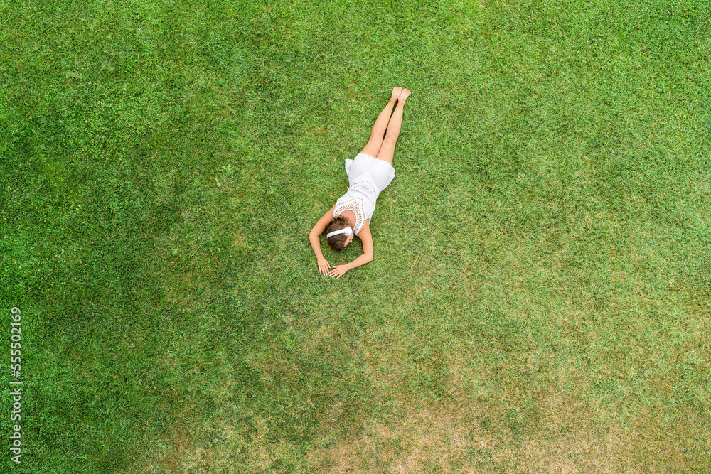 Woman in a white dress and headphones, lying on the green grass sunbathes at summer day. Top view, drone, aerial view