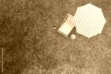 Yellow umbrella with deck chair on the green grass sunbathes at summer day. Top view, drone, aerial view.