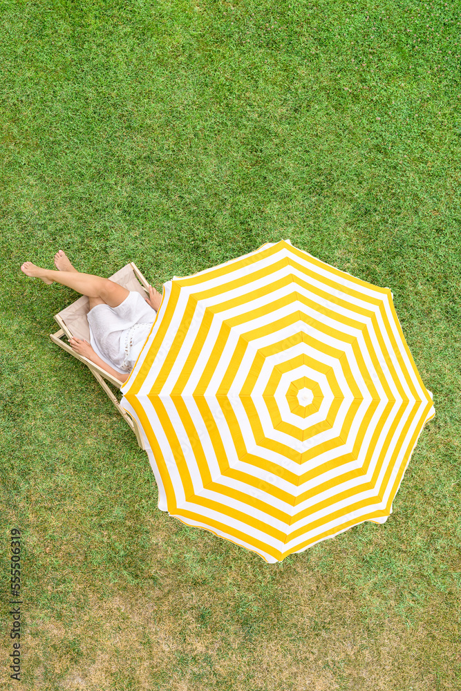Woman in a white dress sitting on deck chair under yellow umbrella on the green grass sunbathes at summer day. Top view, drone, aerial view.