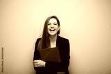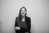 Woman lawywr holding blue clipboard or tablet. Isolated portrait with copy space.