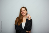 Smiling woman holding water glass. isolated female portrait with black suit.