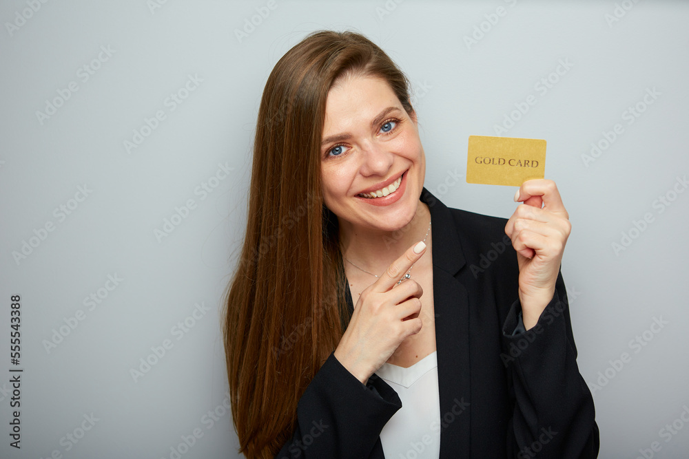Smiling woman holding credit card and pointing with finger. Isolated female portrait.