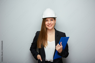 Woman architect engineer profession holding blue tablet.