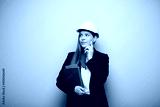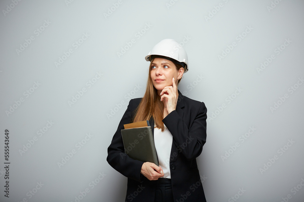 Serious thinking business woman holding book. Female worker in white safety helmet.
