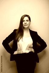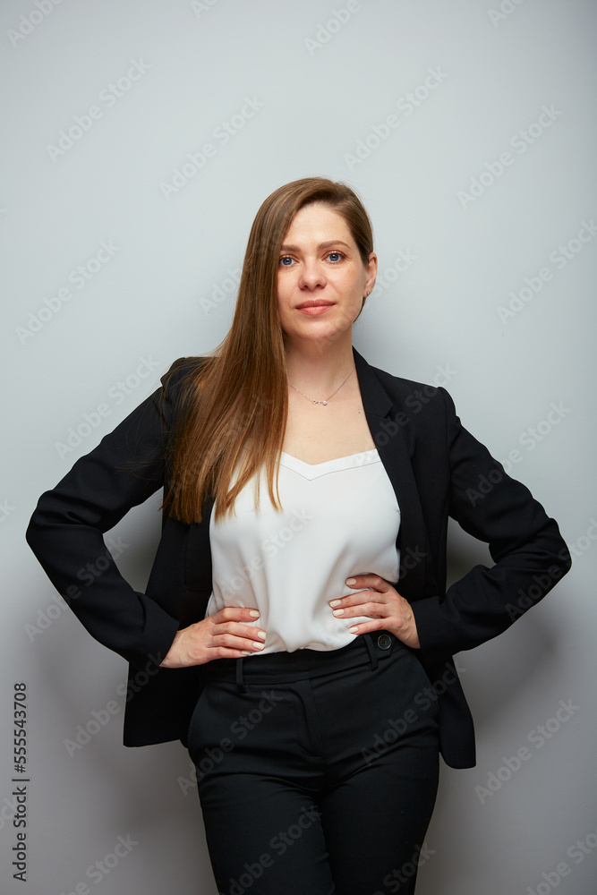 Smiling business woman in black suit. Isolated portrait with copy space.