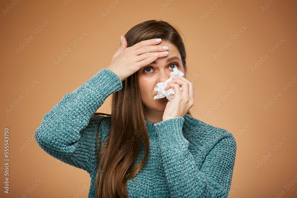 Sick woman with fever. isolated female portrait. Medicine advertising concept.
