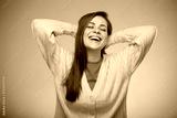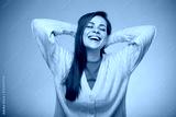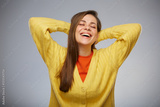 HAppy woman in yellow holding raised hands up behind her head, closed eyes. Isolated advertising portrait.
