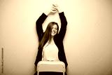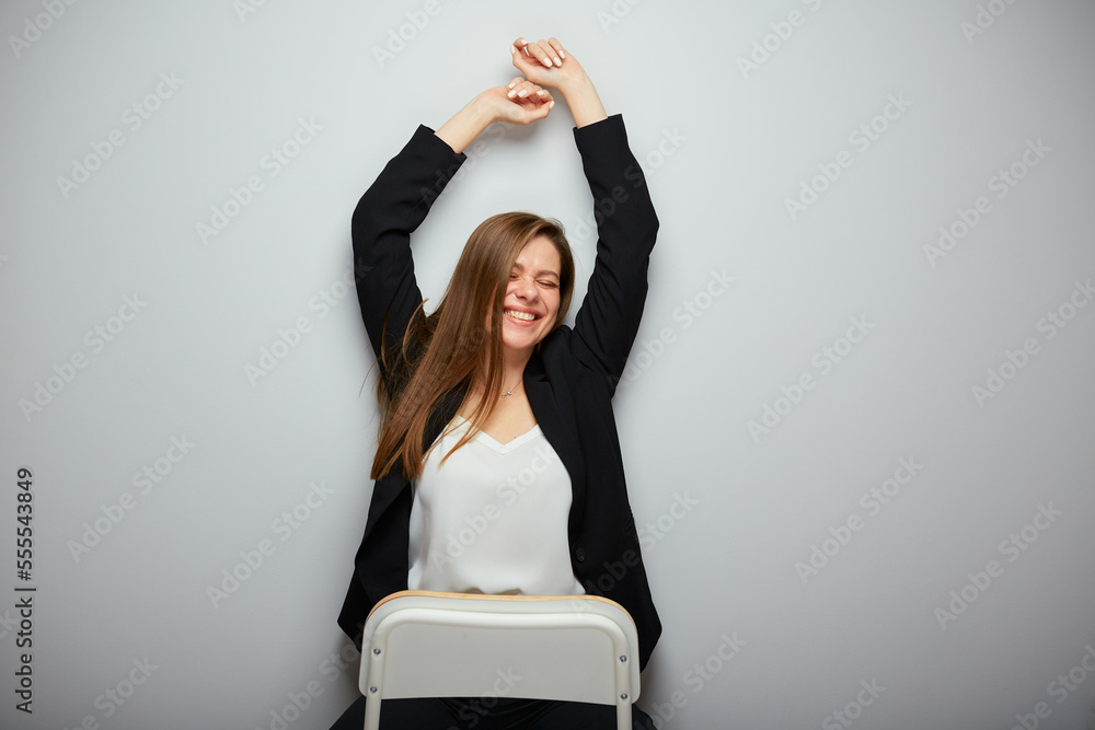 Happy business woman in black suit sitting on chair with closed eyes. isolated portrait with copy space.