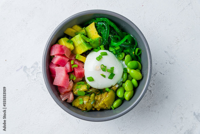 Ahi poke with tuna, avocado, edamame, cucumbers, chukka and poached egg