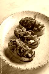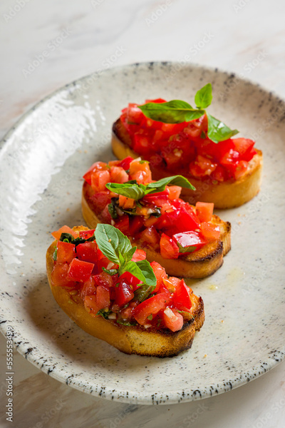 bruschetta with sliced tomatoes cubes and basil on plate on marble table vertical