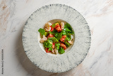 salad with shrimp, avocado and tomatoes on a plate on marble table top view
