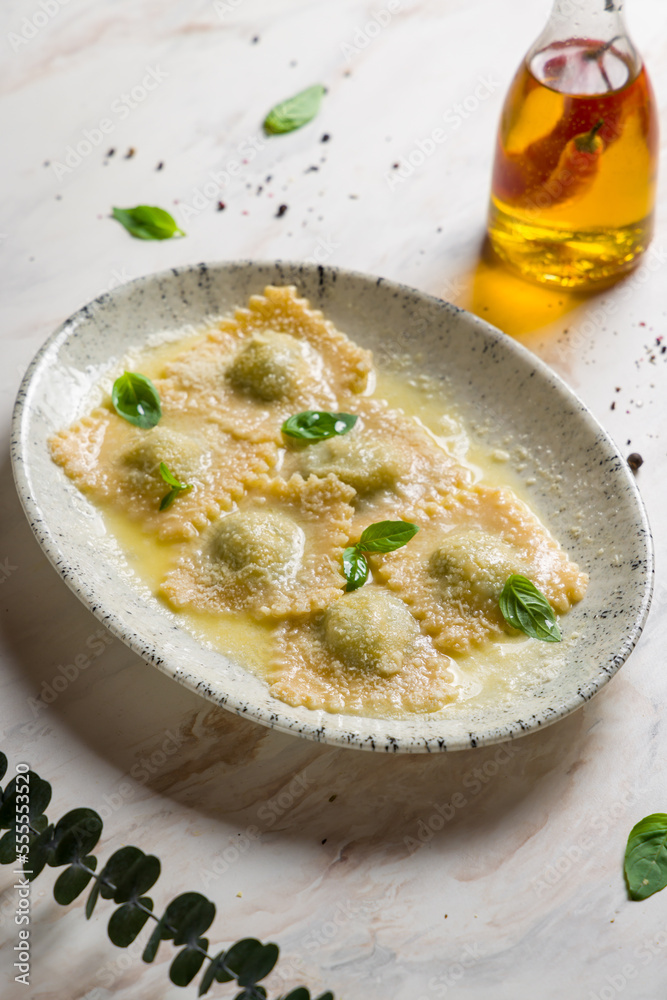 Ricotta and spinach Ravioli on plate on marble table vertical