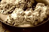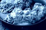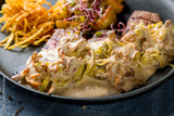 medallions of beef with creamy sauce and mushrooms on black plate macro close up