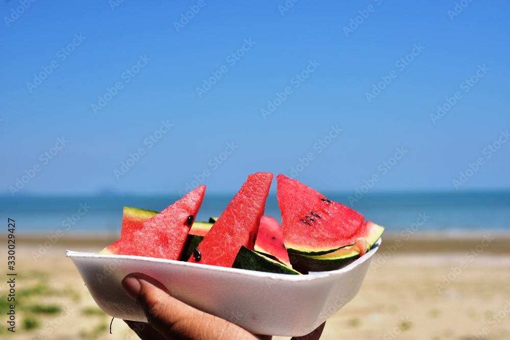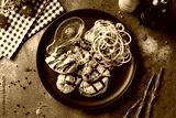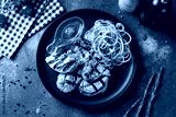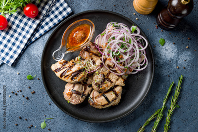 Kebab of pork with red onion and tomato sauce on black plate top view