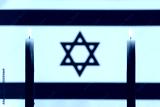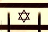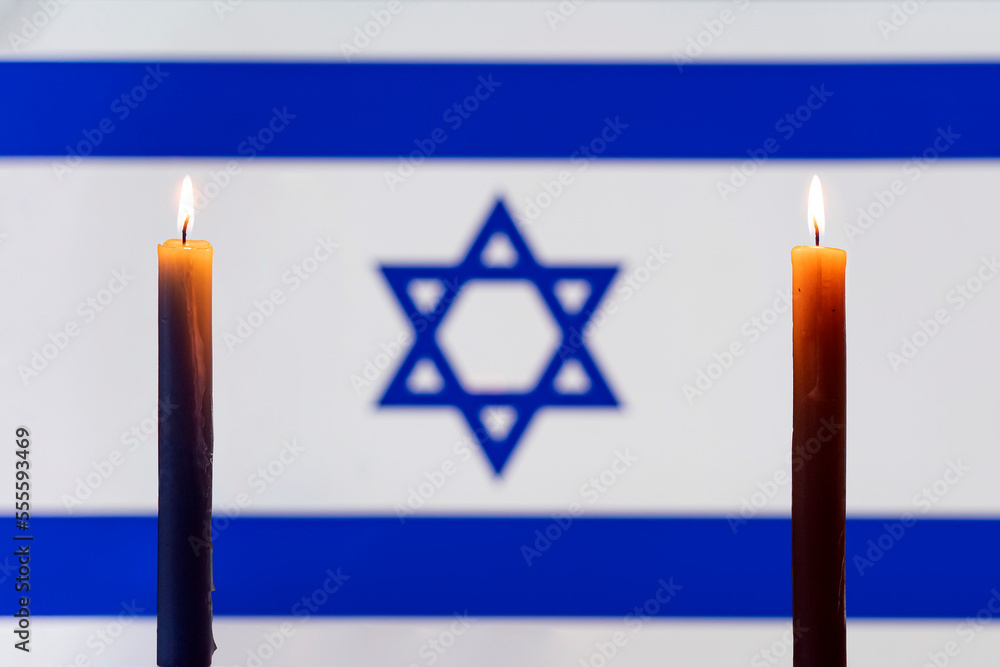 Mourning in the country. burning candle on the background of the israel flag. Victims of cataclysm or war concept. memorial day, remembrance day. National mourning.