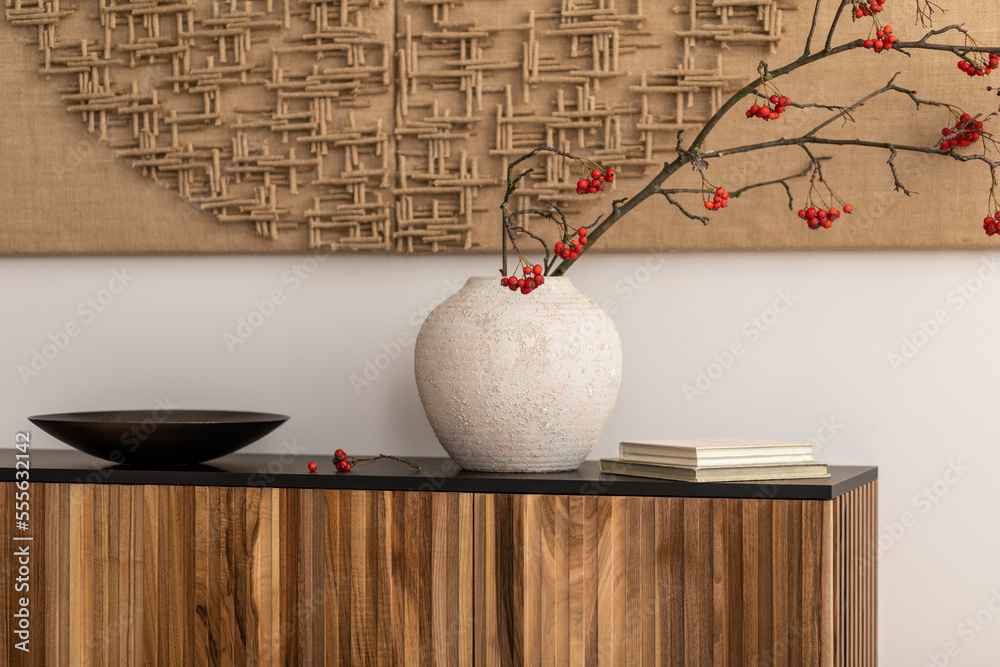 Minimalist composition of living room interior with mock up poster frame, wooden sideboard beige vase with rowan, black bowl, white wall, books and personal accessories. Home decor. Template.