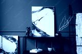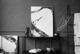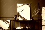 Interior design of living room with mock up poster frame, black stool, sculpture, dark wall, ladder, book, rattan armchair, dark wall with stucco and personal accessories. Home decor. Template.