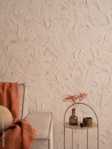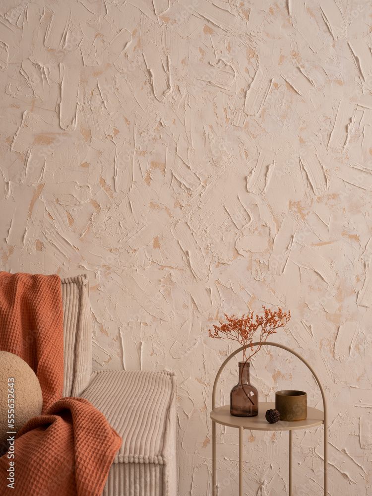 Cozy composition of living room interior with structural wall, modular beige sofa, salmon pink plaid, round pillow, coffee table, vase with dried flowers and personal accessories. Home decor. Template