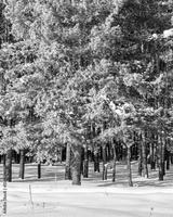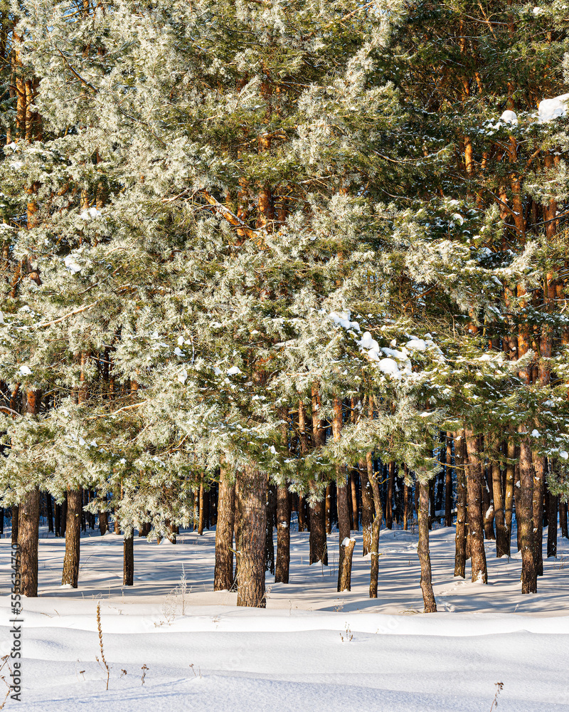 Winter pine forest covered with snow and hoarfrost on a sunny day.