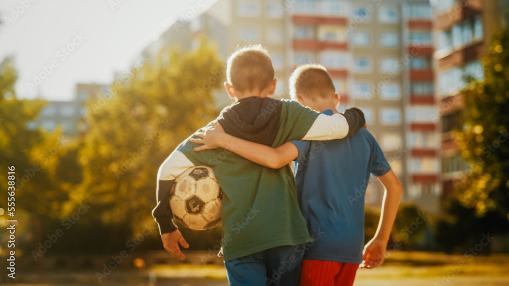Two Young Caucasian Boys Embracing Each Other while Walking to a Neighborhood Football Pitch in Sport Clothes. Soccer Players Carrying a Ball to Play. Concept of Sports, Childhood, Friendship.
