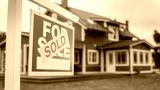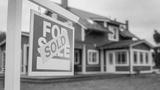 Close Up of a House Sold Sign on a Lawn in Front of a Big Modern House with Traditional Architecture. Housing Market Concept with Residential Property in the Countryside.