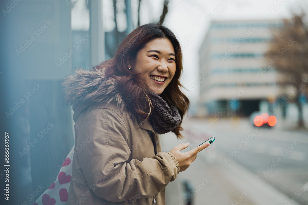 Young woman using mobile phone while standing at bus stop