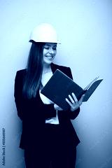 Woman wearing safety helmet holding open book. Student or teacher engineer or architect. Isolated portrait.